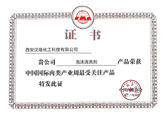 展會上,漢隆公司為肉類加工企業提供的產品有堿性泡沫清洗劑、酸性泡沫清洗劑、食品級過氧化氫消毒劑、食品級過氧乙酸消毒劑、食品級次氯酸鈉消毒劑等,滿足全方位的清洗和消毒殺菌。其中“堿性泡沫清洗劑”“酸性泡沫清洗劑”更是廣受好評,關注度最高,并獲得”中國國際肉類產業周最受關注產品”證書。