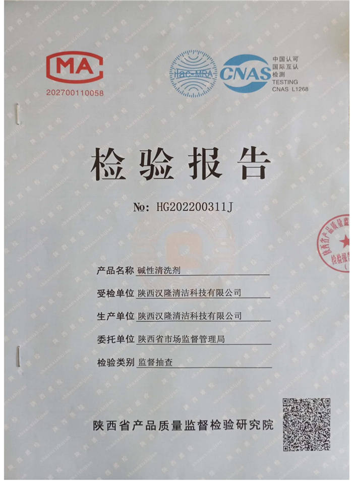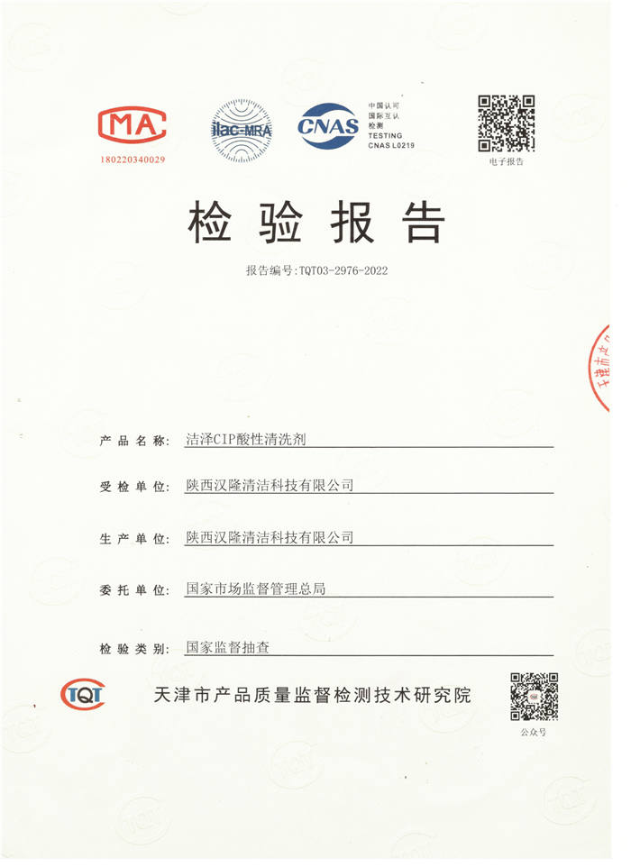 陜西省市場監督管理局委托陜西省產品質量監督檢驗研究院對我公司生產的堿性清洗劑和酸性清洗劑分別進行了檢驗,檢驗結果為“合格”。