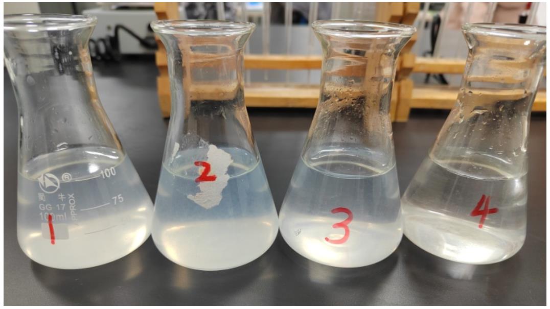 稱取16.7g無水氯化鈣和24.7g硫酸鎂,溶解于10L水中配制硬水樣品,并將其稀釋為625mg/L硬度的水樣;分別取實驗清洗劑樣品1~4(1-3為競品,4為漢隆公司樣品),再依次加入625mg/L硬度的水,攪拌均勻后,硬水樣品變化如下: